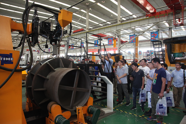 會議第一天的下午,全體代表乘車來到山東時(shí)代新紀(jì)元機(jī)器人有限公司及北京時(shí)代濟(jì)南焊接工業(yè)園參觀。時(shí)代機(jī)器人公司同仁為各位代表展示了機(jī)器人焊接技術(shù)在典型結(jié)構(gòu)件焊接中的應(yīng)用實(shí)例。時(shí)代展示的產(chǎn)品包括:相貫線管道焊接機(jī)器人、200公斤雙軸變位機(jī)配8軸聯(lián)動相貫線焊接機(jī)器人、車廂板焊接機(jī)器人、鋁合金焊接機(jī)器人等。產(chǎn)品展示中還安排了人工焊接與機(jī)器人焊接的競賽吸引眾多代表圍觀,最終機(jī)器人方以工作速度快,焊縫成形美觀等優(yōu)勢勝出。在時(shí)代焊接工業(yè)園,各位代表參觀了時(shí)代自動焊設(shè)備生產(chǎn)線及焊機(jī)裝配生產(chǎn)線,同時(shí)還觀看了時(shí)代自動焊割設(shè)備表演。通過現(xiàn)場參觀和溝通。專家們對時(shí)代產(chǎn)品有了更加全面的了解和認(rèn)識。同時(shí),他們期待著與時(shí)代公司在特種設(shè)備焊接技術(shù)方面進(jìn)行更深入和更廣泛的交流及合作。